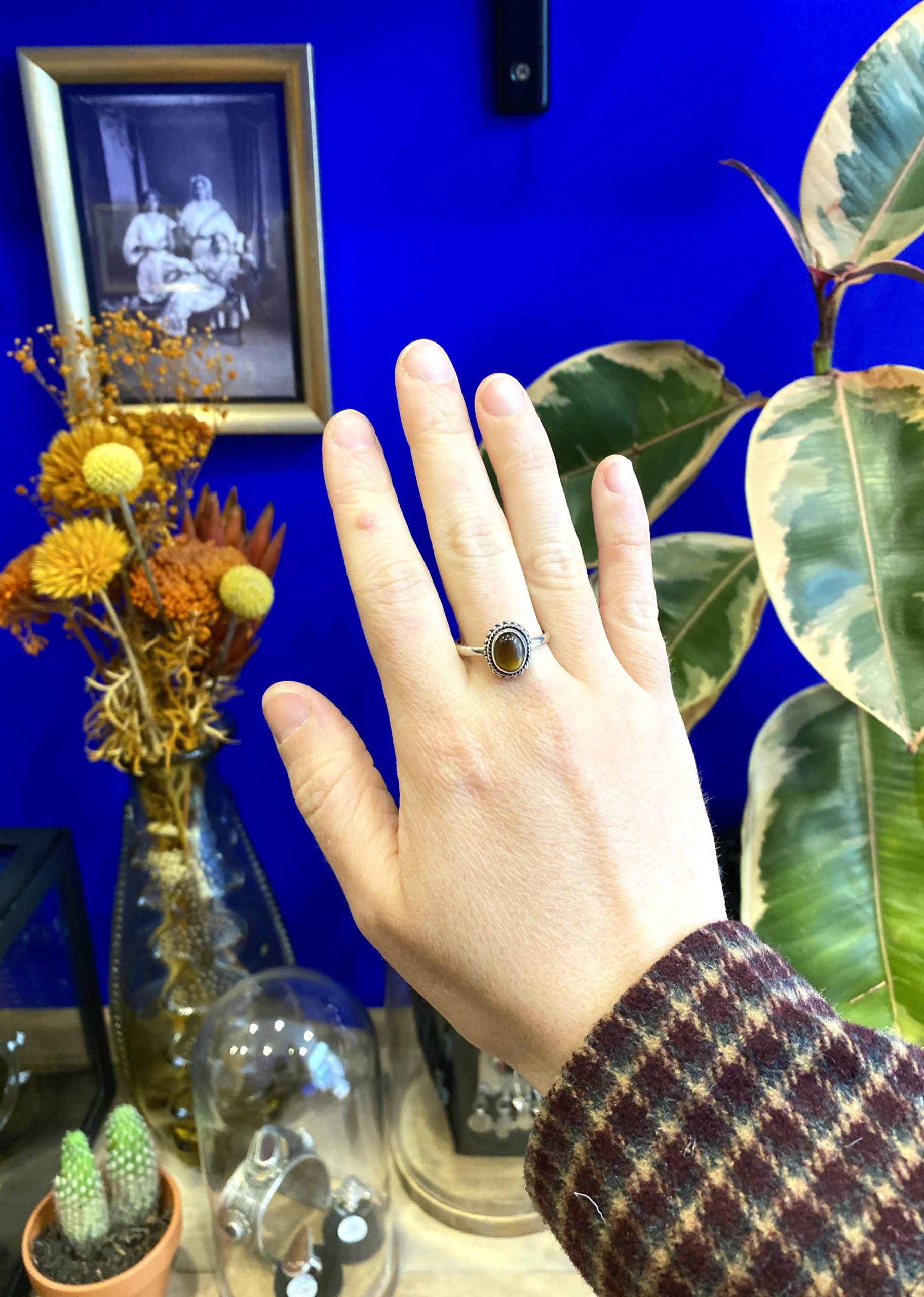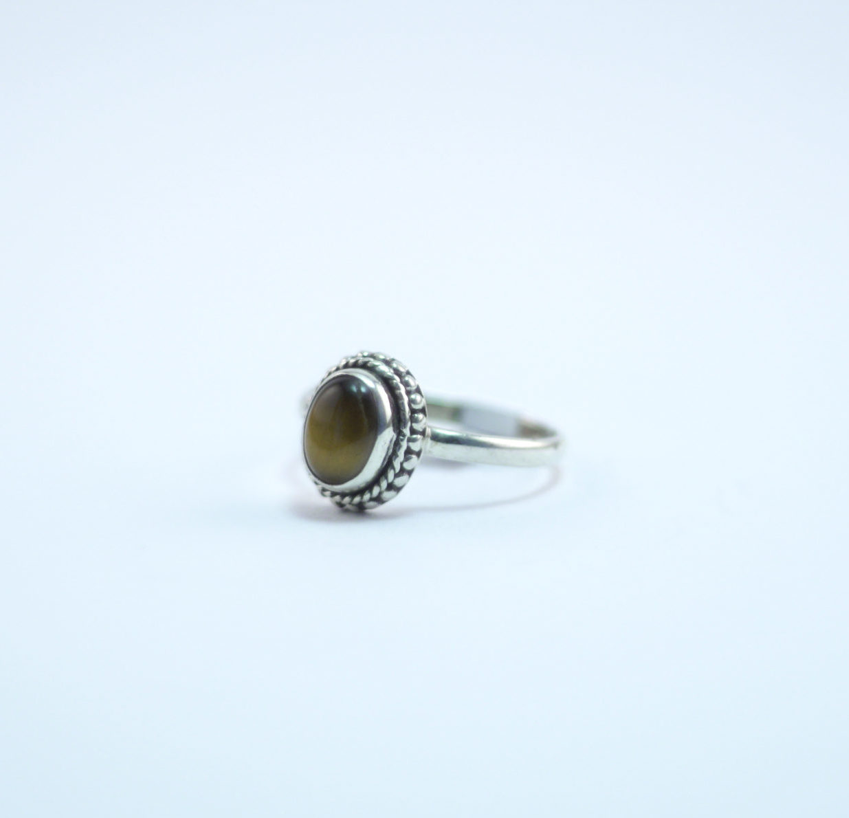 Jolie bague indienne en argent massif 925 et sertie d’une véritable pierre semi-précieuse d’oeil de tigre.