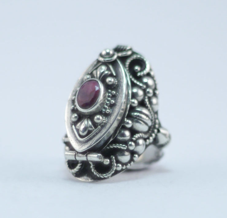 De style manchette, cette bague « poison » s’ouvre pour y glisser un petit trésor personnel et bien gardé, que l’on porte toujours avec soi (mot d’amour, terre-souvenir d’un endroit que l’on aime, photos etc). Entièrement sculptée à la main, son travail de dentelle d’argent est ici vertigineux et quasi architectural: à l’image des fresques qui ornementent les anciens palais Maharadjas, en Inde. Ce qui confère à ce bijou unique, raffinement et prestige !